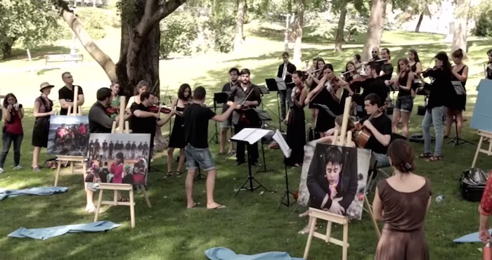 Con una duración de casi 3 minutos, la grabación muestra a un grupo de músicos que coloca caballetes con cuadros que pronto serán revelados ante la gente que llena de curiosidad se acerca a escuchar la pieza "Yo soy del Mediterráneo", al tiempo que descubren imágenes de migrantes con sus hijos en brazos, rostros que expresan evidente dolor y angustia.