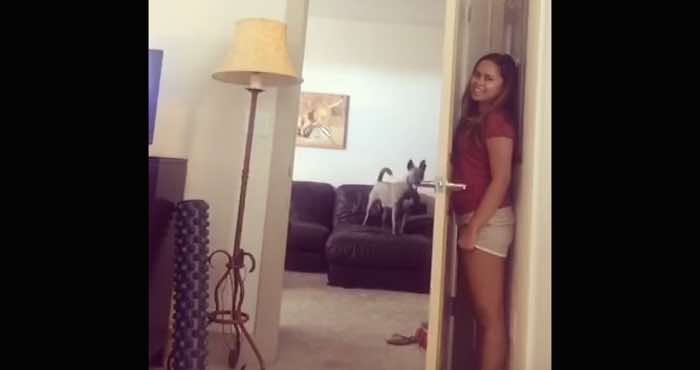 La escena es simplemente adorable: la chica transmite júbilo, pues no puede dejar de divertirse a sabiendas de que su compañero canino no puede hallarla; y el cánido simplemente corre y recorre toda la estancia en busca de su dueña sin tener pista alguna de su paradero.