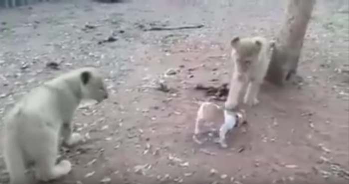 Ciudad de México, 24 de Septiembre (SinEmbargo).- Un pequeño perro defiende un pedazo de comida de tres leones cachorros que intentan quitársela.