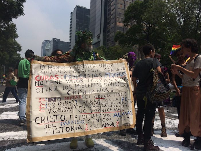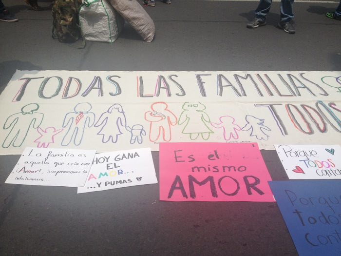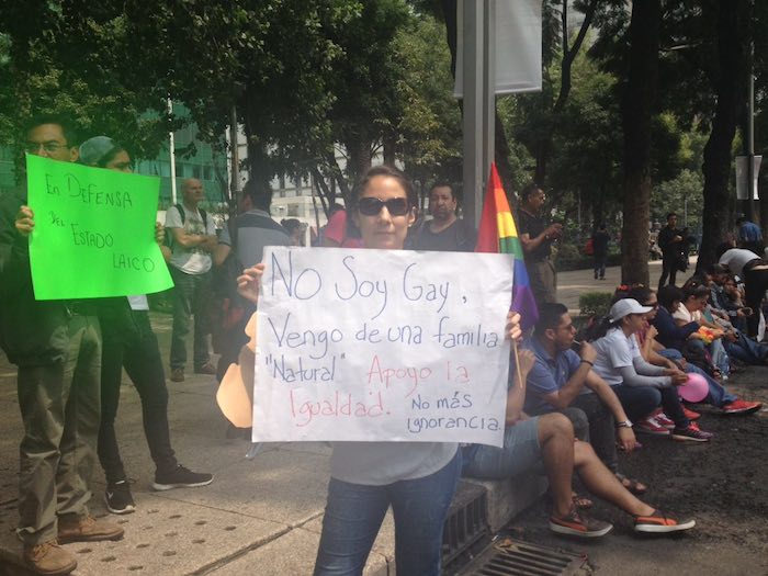 "Soy católico y soy gay ¡Quiero platicar contigo!", se leía en algunos carteles que portaban manifestantes favor de los matrimonios igualitarios.