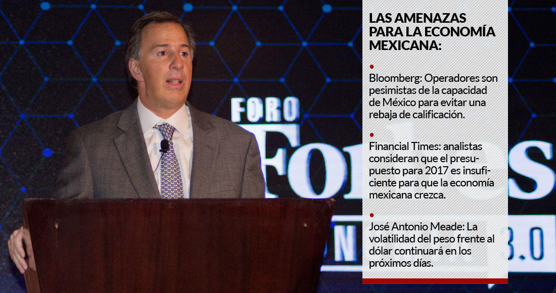 Analistas y operadores financieros son cada vez más pesimistas respecto de la capacidad de México de evitar una rebaja de calificación crediticia, informaron hoy los diarios Financial Times y Bloomberg. Aunado a ello, dicen, la depreciación del peso en los últimos días derivado de las elecciones en Estados Unidos están causando incertidumbre sobre la economía mexicana. Este mismo día, el titular de la SHCP, José Antonio Meade, advirtió que la volatilidad del peso frente al dólar continuará en los próximos días, debido a contexto externo.