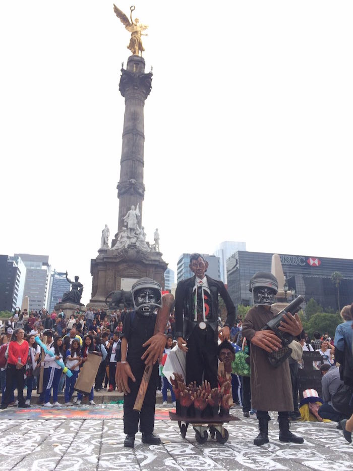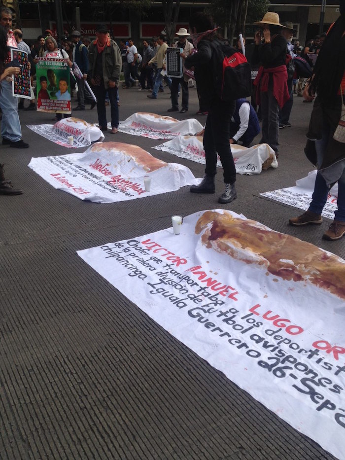 Frente a la Glorieta de Colón, han colocado cadáveres envueltos en sábanas blancas. Son las que fueron asesinadas durante aquella maldita noche en Iguala. Entre ellos, Julio César, el normalista cuyo rostro quedó destruido.
