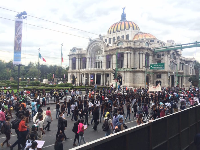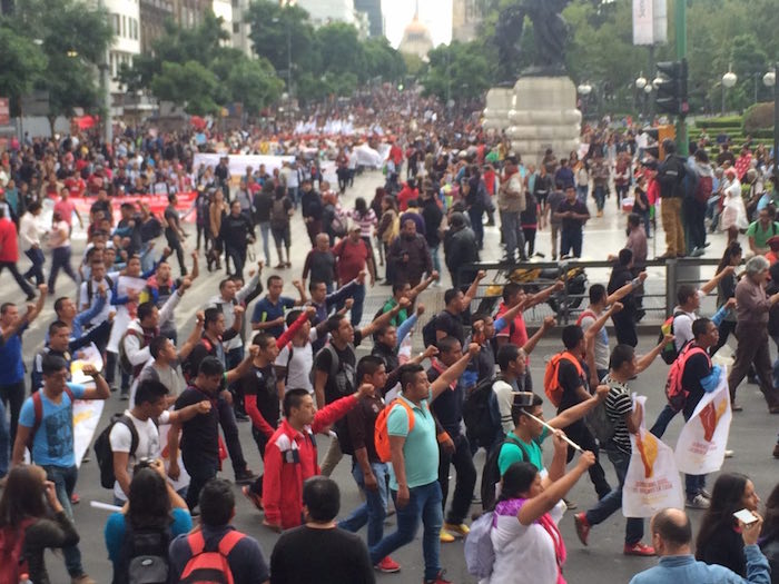 Dos horas después de haber partido del Ángel de la Independencia, los padres de los normalistas llegaron al Zócalo de la Ciudad de México. Los últimos de la masiva manifestación siguen marchando por Palacio de Bellas Artes y entrando por la calle 5 de mayo.
