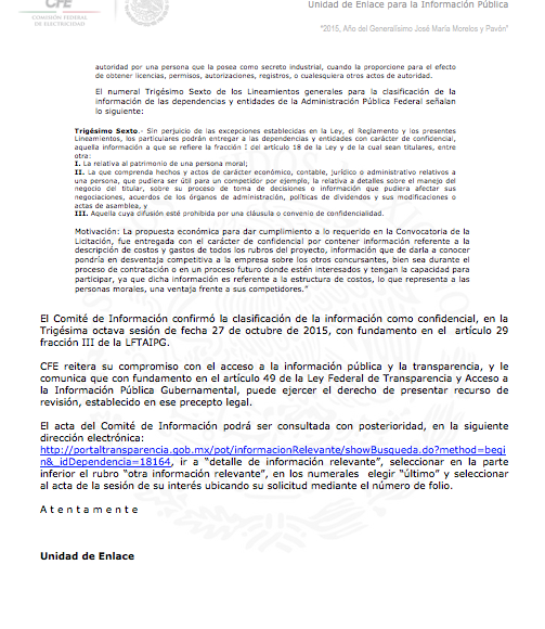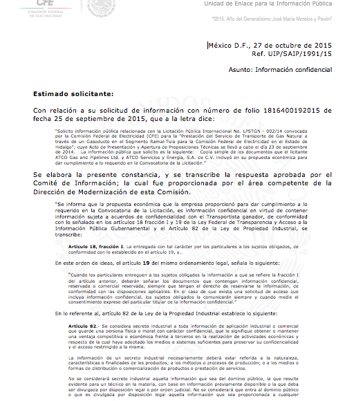 En 2015, un ciudadano solicitó copia simple de los documentos que Atco Gas and Pipelines Ltd. y Atco Servicios y Energía S.A. de C.V. incluyeron en su propuesta económica para “dar cumplimiento a lo requerido en la convocatoria de la licitación”, mediante el Instituto Nacional de Acceso a la Información Pública y Protección de Datos Personales (INAI). La CFE respondió que la propuesta económica era “confidencial” y luego, el comité de información de ese órgano la clasificó con esa categoría.