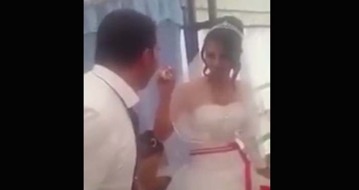 El hombre no tomó el gesto con humor y le dio un manotazo a su esposa, lo cual acabó con el encanto del significativo momento. La mujer mostró un rostro de dolor y vergüenza ante sus invitados y agachó la mirada. El video ha sido compartido por los usuarios en Internet.