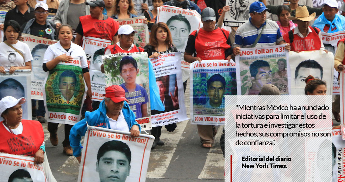 Ciudad de México, 6 de octubre (SinEmbargo).– Si bien México ha anunciado una serie de iniciativas para frenar el uso de la tortura y prometió investigar las desapariciones forzadas, sus compromisos no son de confianza, debido al impresionante mal manejo de la investigación en la presunta matanza de los 43 normalistas desaparecidos hace dos años, destaca el diario New York Times en su editorial de este jueves.