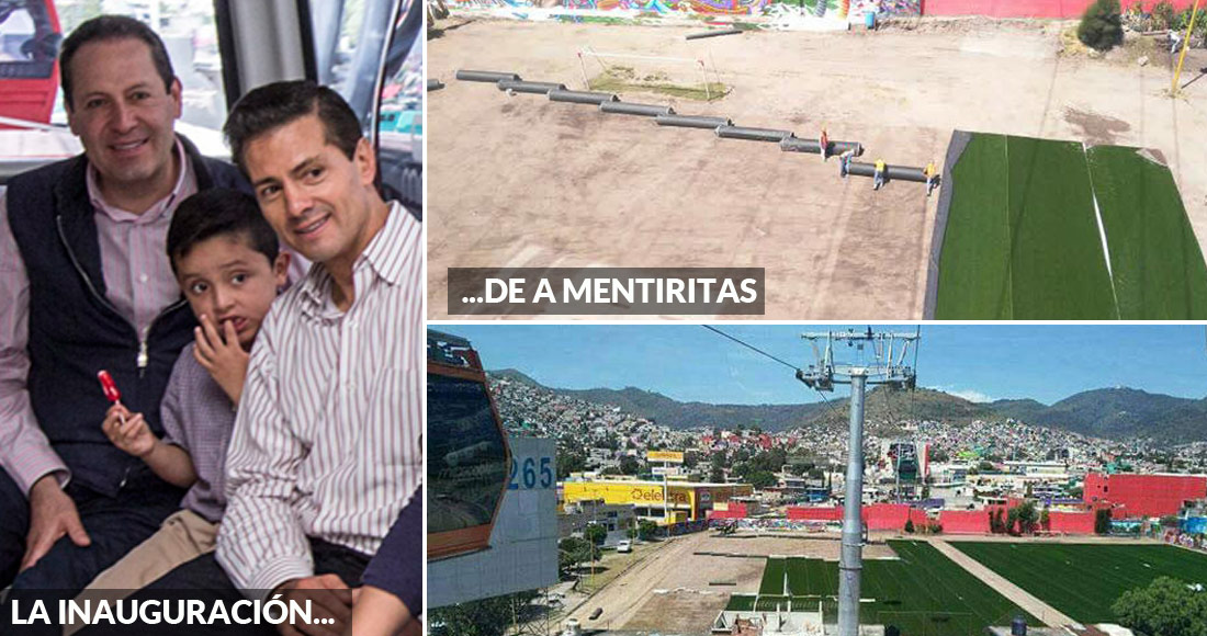 Desde las alturas, a bordo del nuevo teleférico de Ecatepec, en primer cuadro, se encuentran unas canchas de futbol deterioradas a las que, para los spots y la inauguración, se les ocurrió cubrir de pasto sintético, que ahora, a dos días del evento en el que estuvo presente el Presidente Enrique Peña Nieto, está siendo retirado, según han denunciado usuarios en las redes sociales. Ecatepec ha vuelto a su realidad.