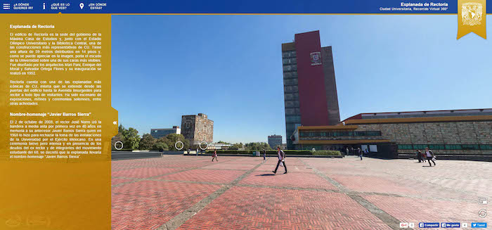 Ciudad de México, 09 de octubre (SinEmbargo).–La Universidad Nacional Autónoma de México (UNAM), a través del sitio http://www.tucomunidad.unam.mx/360/ ha lanzado un Recorrido Virtual 360º, que permite a los visitante dar un paseo visual por las instalaciones de Ciudad Universitaria (CU).