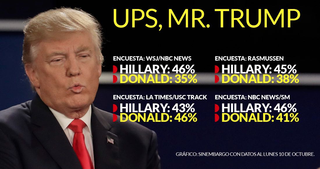 Hace apenas dos semanas, la misma encuesta mostraba a Clinton y Trump empatados a 43 por ciento, pero tras el primer debate de Hempstead (Nueva York) del 9 de octubre la distancia se amplió a seis puntos (47 por ciento-41 por ciento) y tras el escándalo del video con comentarios machistas del magnate se ha elevado aún más hasta los 11 puntos.