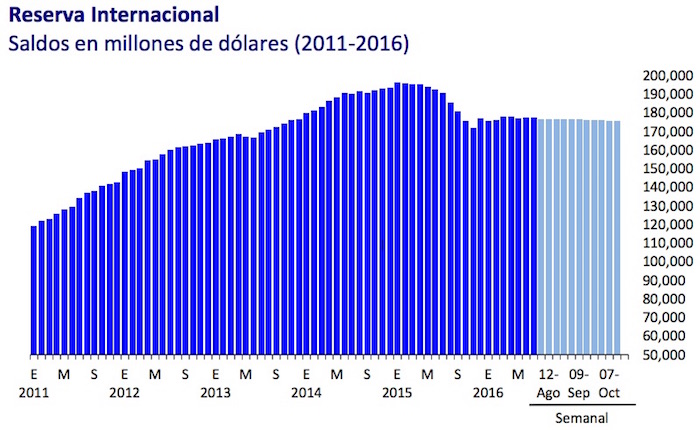 El Banco de México (Banxico) informó que el saldo al cierre de la semana, del 10 al 14 de octubre, fue de 175,219 millones de dólares, el nivel más bajo para las reservas en ocho meses y medio.