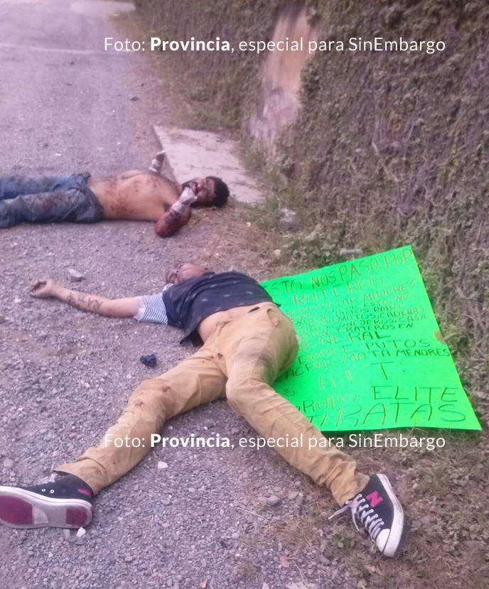 El mensaje indicaba que eso les pasó "por rateros" y por no respetar mujeres y niños. El supuesto grupo de justicieros advirtió que lo mismo le ocurrirá a robacoches, ladrones de motocicletas, de cadenas, celulares, de casa habitación, "conejeros" y rateros en general.