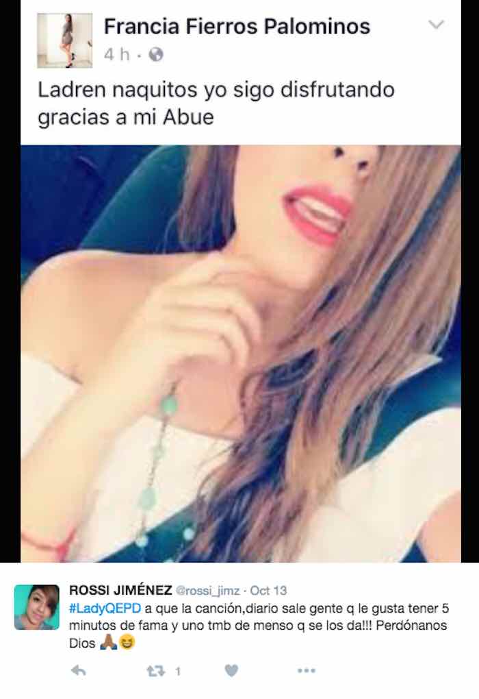 Posteriormente la joven publicó una fotografía en Facebook en la que se observa mirándose al espejo. La selfie va acompañada de ña leyenda “Regresando del funeral... #DescansaEnPazAbu”. Esta imagen fue ampliamente criticada y repudiada, ya que muchos usuarios consideraron que se trataba de una falta de respeto.