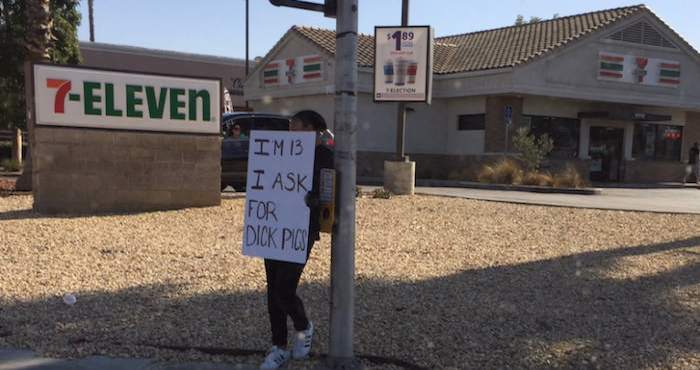 Esta es la imagen que ha estado circulando en redes sociales desde el martes. La jovencita fue vista para en la esquina de las avenidas La Sierra y Magnolia, sosteniendo una pancarta que leía: “Tengo 13 años/Pido fotos de penes”.