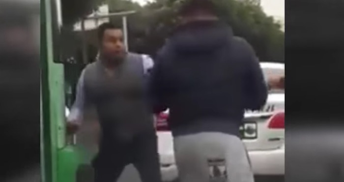 En el video captado por un automovilista que circulaba por el lugar se observa cómo los dos conductores detuvieron sus unidades y comenzaron a pelar a mitad de la calle.