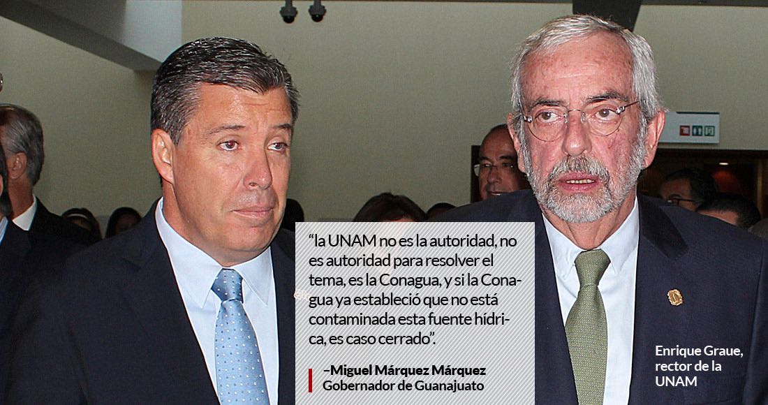 Ciudad de México, 27 de octubre (SinEmbargo/ZonaFranca).– El Gobernador de Guanajuato, Miguel Márquez Márquez, durante una visita al municipio de San José Iturbide declaró que la Universidad Nacional Autónoma de México (UNAM) no era la autoridad para decidir sobre el pozo de agua contaminada en la comunidad de La Cantera sino la Comisión Nacional del Agua (Conagua), dependencia que determinó que el agua del pozo era potable.