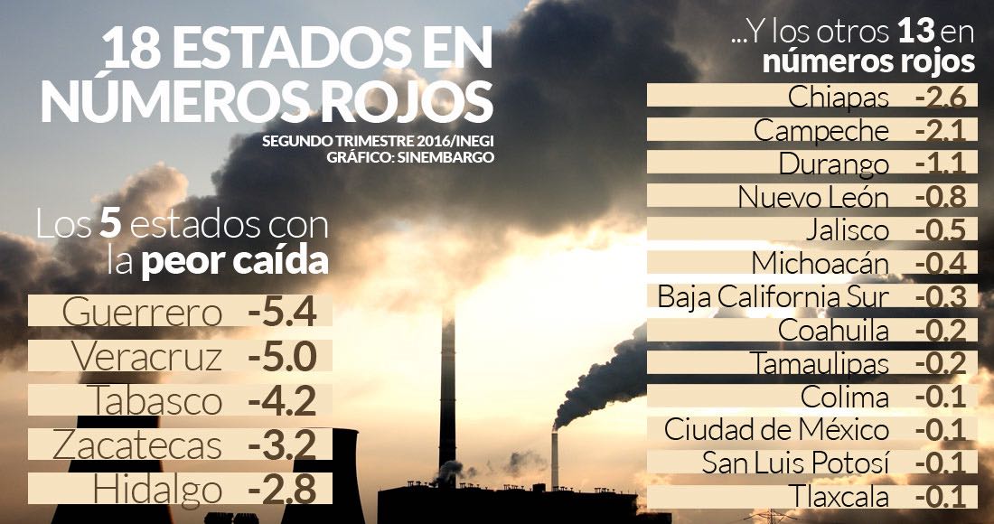 Guerrero reportó la mayor caída con 5.4 por ciento, según las cifras desestacionalizadas de abril a junio de este año, la mayor caída desde el segundo trimestre de 2009 donde su pérdida fue de 6.94 por ciento, seguido por Veracruz, Tabasco y Zacatecas, Hidalgo, Chiapas...