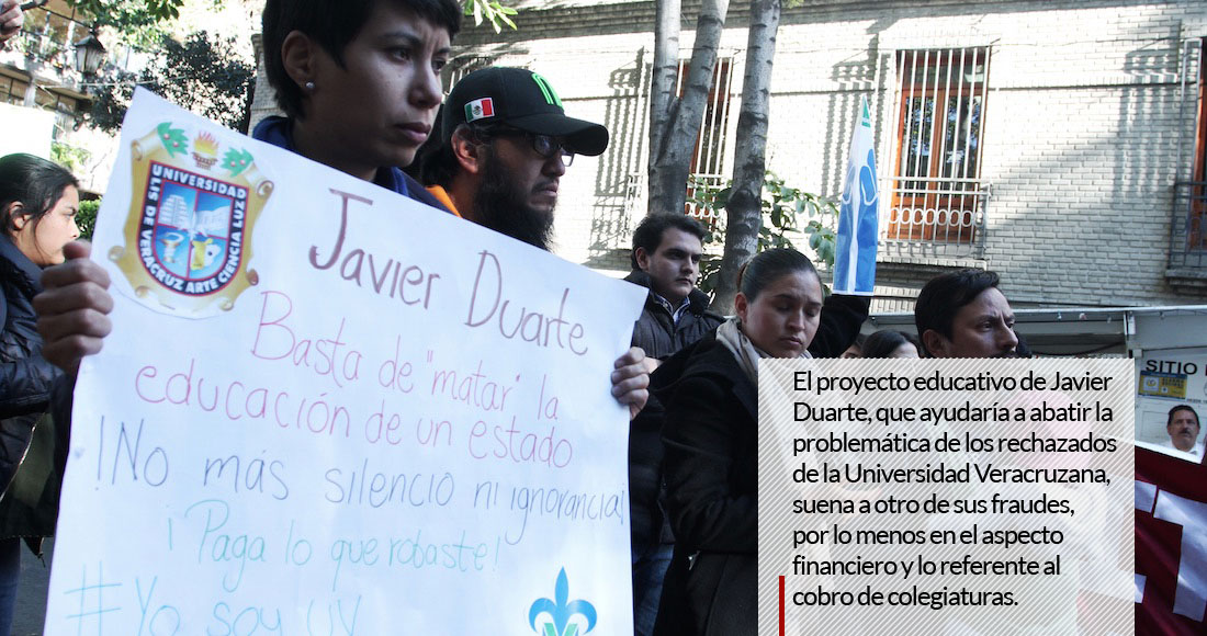 El proyecto educativo de Javier Duarte de Ochoa, y que ayudaría a abatir la problemática de los rechazados de la Universidad Veracruzana, la Universidad Popular Autónoma de Veracruz (UPAV), tiene la misma ruta de los fraudes detectados hasta hoy. Por lo menos en el aspecto financiero y en lo referente al cobro de colegiaturas. En la opacidad total se encuentra el cobro de las cuotas por colegiatura que realiza la institución, de acuerdo con la cuenta pública 2015 revisada por el Órgano de Fiscalización Superior.