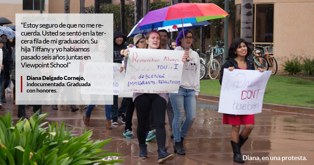 En la carta que le envió, Diana le explicaba a Trump que, gracias a una beca, ella se graduó de la prestigiada secundaria Viewpoint, en Los Ángeles, en la misma ceremonia que Tiffany, la hija que el magnate tiene con su anterior esposa, Marla Maples. Una indocumentada se había graduado el mismo día, de la misma escuela que la hija de quien en ese momento era el candidato republicano a la Presidencia.