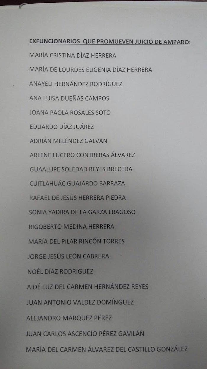 El Secretario de Gobierno entregó a SinEmbargo una lista con los nombres de los ex funcionarios que tramitaron un amparo en donde destacan: María de los Lourdes Eugenia Díaz Herrera, Anayeli Hernández Rodríguez, Ana Luisa Dueñas Campos, Joana Paola Rosales Soto, Adrián Meléndez Galván, Arlene Lucero Contreras Álvarez, Guadalupe Soledad Reyes Breceda, Cuitláhuac Guajardo Barraza, Rafael de Jesús Herrera Piedra y Sonia Yadira de la Garza Fragoso.