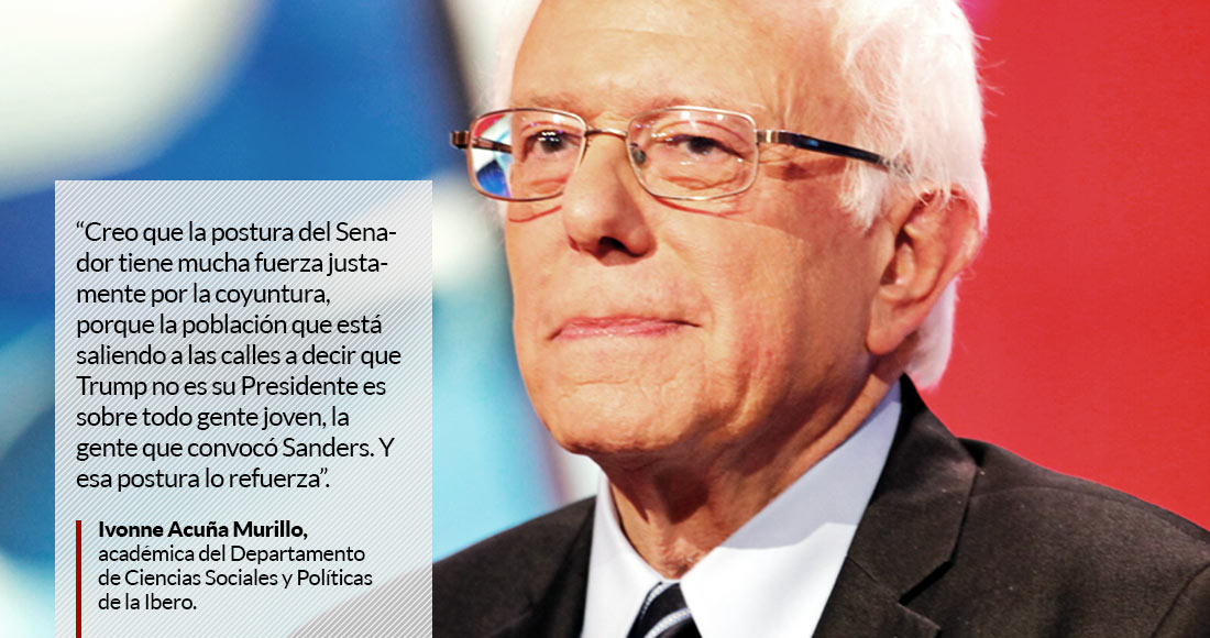 El Senador Bernie Sanders, quien en la precampaña a la candidatura demócrata a la Presidencia se elevó como la voz de los jóvenes estadounidenses contra las grandes corporaciones y la concentración de la riqueza en pocas manos, es ahora, con Donald Trump como Presidente electo de EU, un político necesario ante la polarización que vive ese país, coincidieron especialistas en política internacional. La defensa de las minorías que el Senador lanzó en los últimos días representa una advertencia necesaria para el futuro Presidente que hizo de la construcción de un muro en la frontera con México uno de sus principales ofrecimientos de campaña, plantearon.