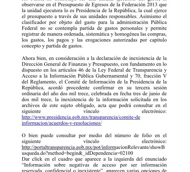 En marzo de 2015, en otra respuesta, esa misma Dirección volvió a remitirse al Clasificador y solicitó al Comité de Información de la Presidencia la declaración de “inexistencia” de esos gastos.