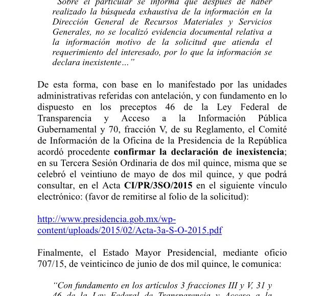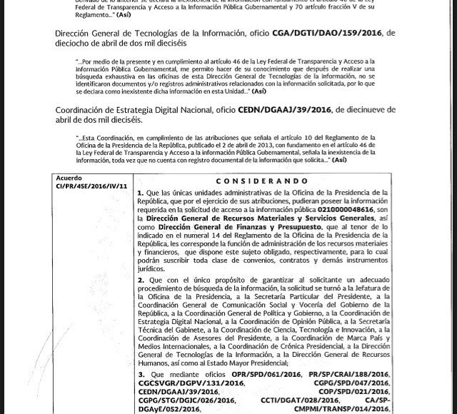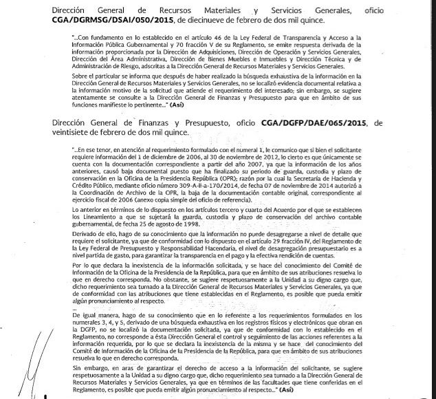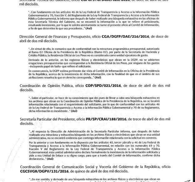 Cada una de las 14, reportó que no encontró nada respecto al papel. Algunas enviaron un oficio para indicar que realizaron "una búsqueda exhaustiva", como la Coordinación General de Comunicación Social y Vocería y la Coordinación de Asesores del Presidente; pero que aun así, no había evidencia documental.