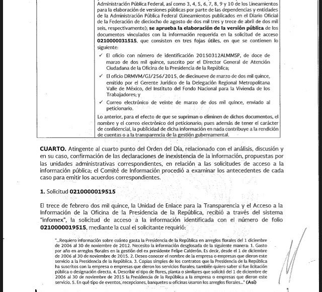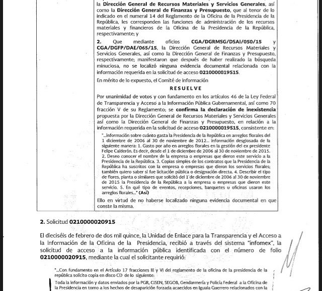 La Dirección General de Recursos Materiales y Servicios Generales y la Dirección General de Finanzas y Presupuesto de Los Pinos, en momentos en que Enrique Peña Nieto era Presidente, buscaron el rastro de las flores de Calderón, el antecesor en esa casa. Y no encontraron nada. Así que el Comité de Información resolvió por unanimidad de votos la declaración de la inexistencia de las flores del ex Mandatario. Si las compró, no las registró. Pero sin registro, en los archivos quedó que esas flores son "inexistentes".