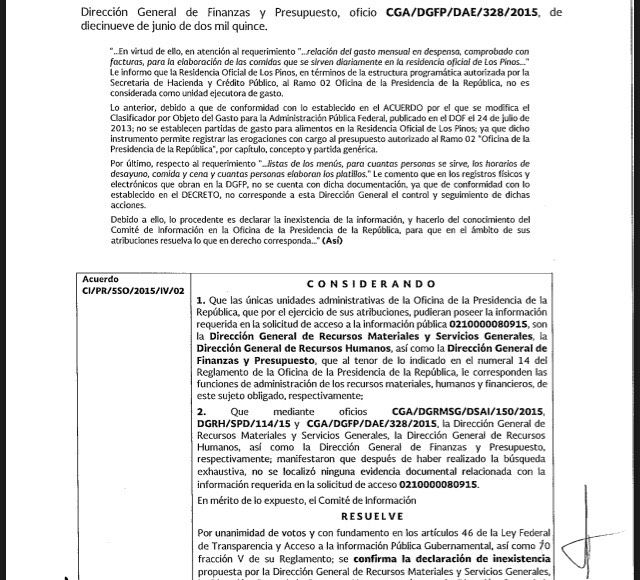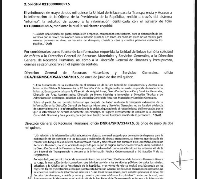 En mayo del mismo año, llegó a la Presidencia la solicitud de la relación del gasto mensual en despensa, comprobado con facturas, para la elaboración de las comidas servidas diariamente en Los Pinos. Se requirió también listas de los menús, el número de personas a las que se les sirve, los horarios de desayuno, cena y cuántas personas elaboran los platillos.