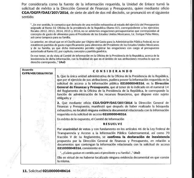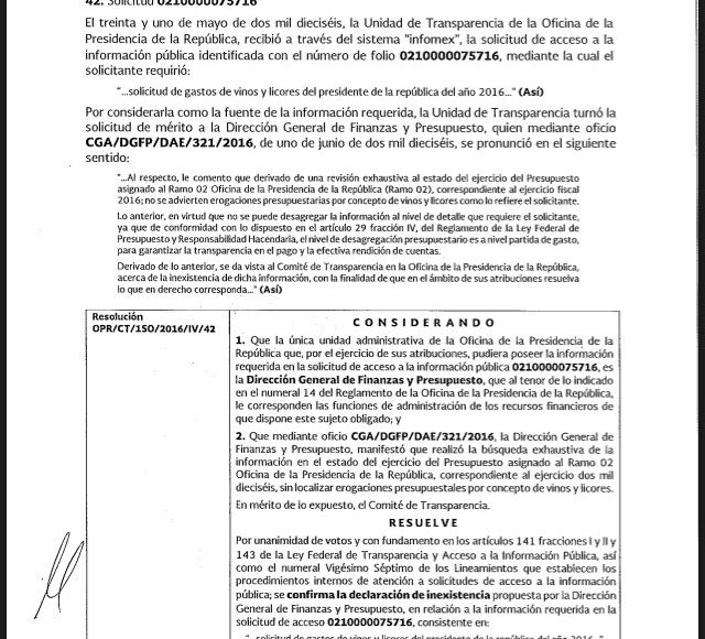 También en mayo, pero de 2016, al Presidente Peña Nieto le preguntaron cuánto gastaba en vinos y licores, y el Comité de Transparencia de la Oficina de la Presidencia de la República admitió que de ello no había evidencia documental y declaró la información "inexistente".