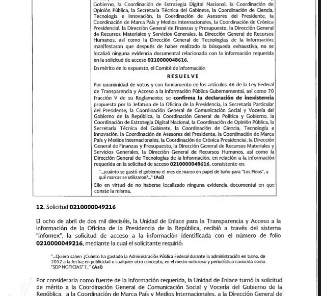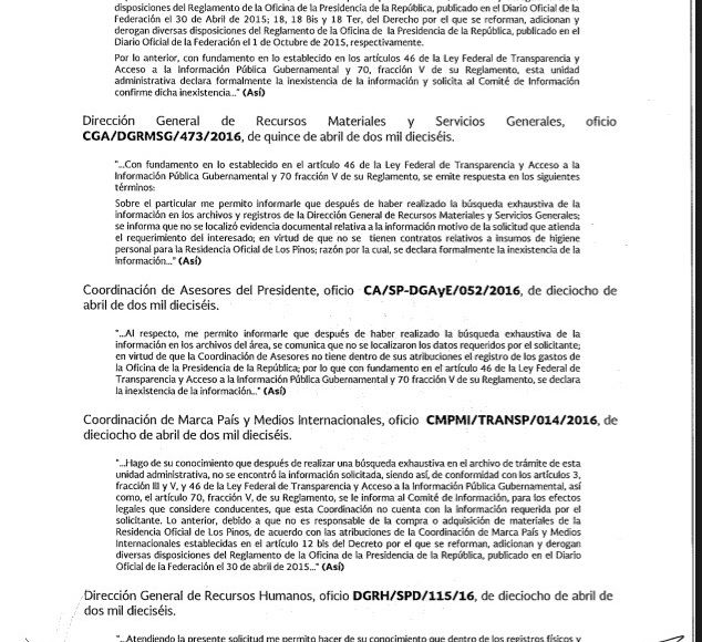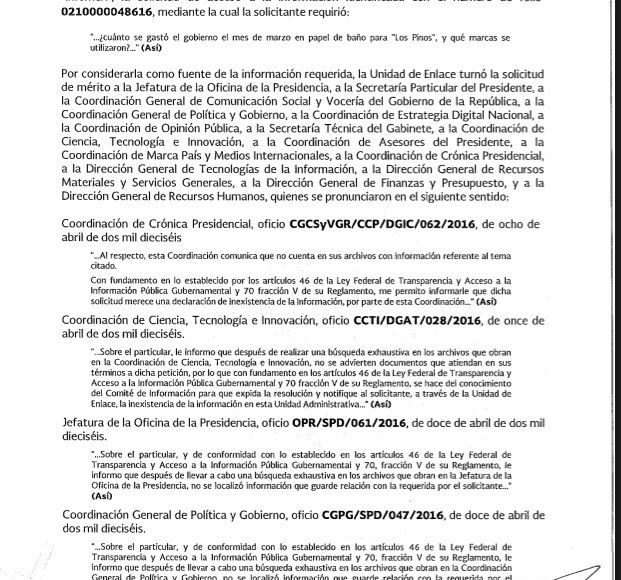 Y otra pregunta sobre el consumo doméstico dentro de Los Pinos en la Presidencia de Enrique Peña Nieto fue sobre el papel de baño y las marcas que se utilizaron en marzo de 2016. Según la Presidencia de la República, 14 de sus instancias trabajaron en la búsqueda de la información. Para dar con documentos o facturas entregadas por Peña Nieto sobre el papel de baño en la casa que ocupa trabajaron la Jefatura de la Oficina de la Presidencia, la Secretaría Particular del Presidente, la Coordinación General de Política y Gobierno, la Coordinación de Estrategia Digital Nacional, la Coordinación de Opinión Pública, la Secretaría Técnica del Gabinete, la Coordinación de Ciencia, Tecnología e Innovación; la Coordinación de Asesores del Presidente, la Coordinación de Marca País y Medios Internacionales, la Coordinación de Crónica Presidencial, la Dirección General de Tecnologías de la Información, la Dirección General de Recursos Materiales y Servicios Generales, la Dirección General de Finanzas y Presupuesto, y la Dirección General de Recursos Humanos.