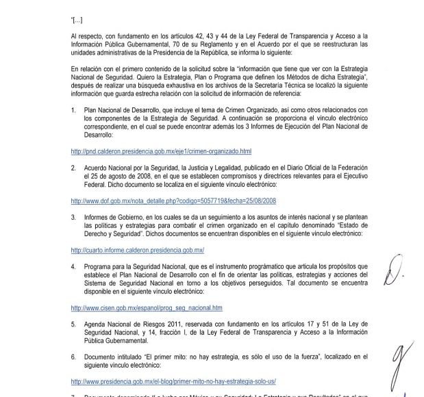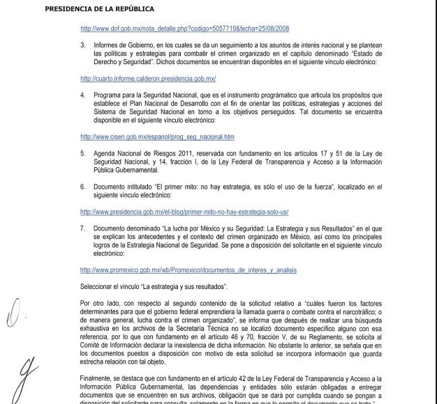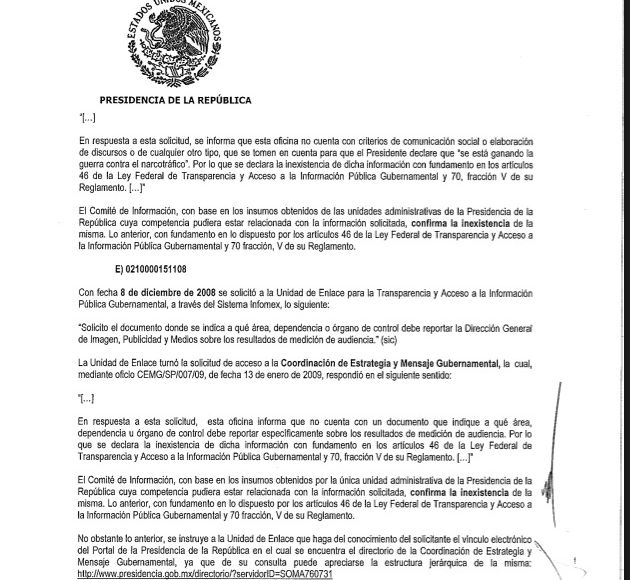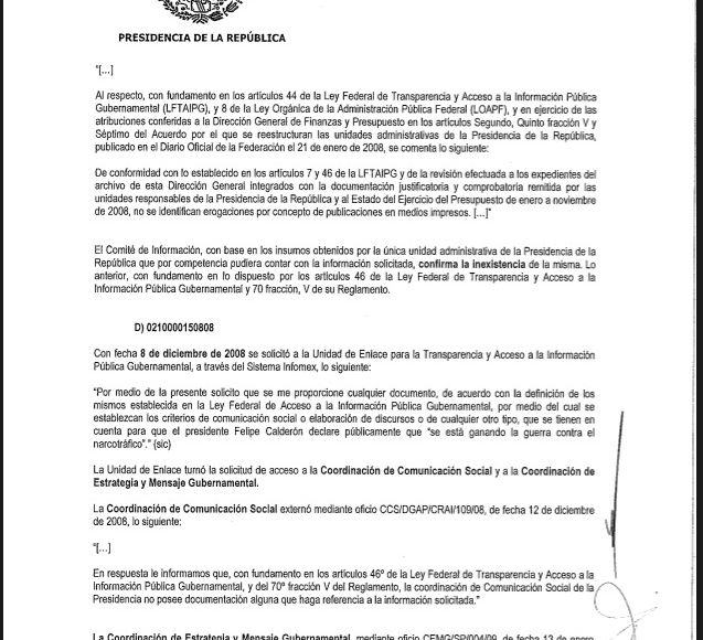 En sus palabras estaba la victoria, pero el entonces Presidente no pudo responder cuáles eran los criterios para indicar que la guerra se estaba ganando o que por lo menos, había una expectativa sustentada para ganarla. A la solicitud de información con el folio 0210000150808 en la que se le requirió cualquier elemento para la elaboración de sus discursos respecto al triunfo, Los Pinos respondió que no contaba con información y el Comité de Información los declaró “inexistentes”.