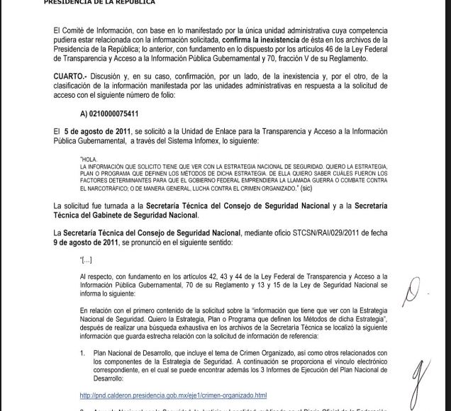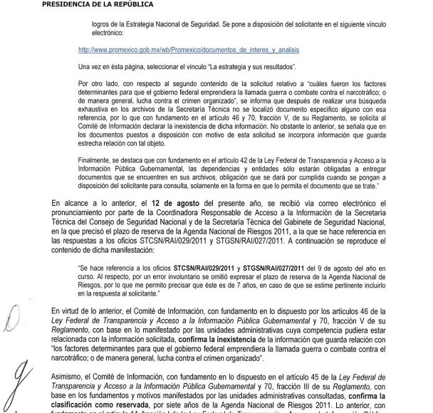 Además, los “factores determinantes” para que el Gobierno federal emprendiera la llamada guerra o combate contra el narcotráfico, o de manera general, lucha contra el crimen organizado” fueron declarados “inexistentes” por Los Pinos ese año, cuando a Calderón le faltaban meses para dejar la Presidencia.