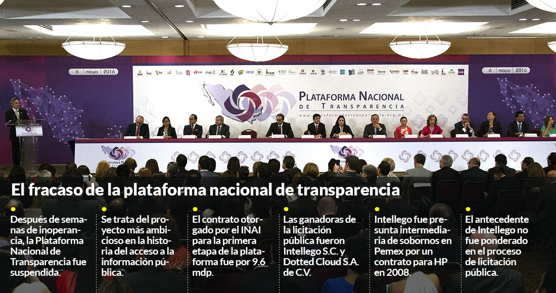 Han pasado 210 días y la Plataforma Nacional de Transparencia sigue sin funcionar por completo. En 2015, el Instituto Nacional de Acceso a la Información (INAI) adjudicó el desarrollo de esta herramienta, la más ambiciosa de la Rendición de Cuentas a la empresa Intellego SC por 9.6 millones de pesos. El plazo de entrega fue de tres meses y medio. La razón: estrenarla el mismo día que entrara en vigor la Ley General de Transparencia. Así fue. La plataforma empezó a operar el 5 de mayo de 2016, pero 22 días después fue desactivada. Óscar Guerra Ford, consejero del INAI, reconoce en entrevista que no estaban conscientes de la magnitud del desarrollo y que, en retrospectiva, el proyecto necesitaba, al menos un año y medio para ser realizado con éxito.