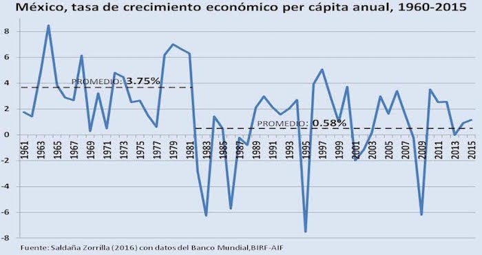 La tasa de crecimiento económico per cápita de México viene en descenso. Durante el período 1960-2015, esta tasa promedio anual ha sido del 1.8%. Sin embargo, si subdividimos el período, observamos que en el periodo 1960-1981 la tasa de crecimiento es del 3.75%, mientras que en el periodo 1982-2015 es de tan sólo 0.58%. Como si se tratara de dos países distintos, el comportamiento de esta tasa de crecimiento entre un período y otro es muy marcado.
