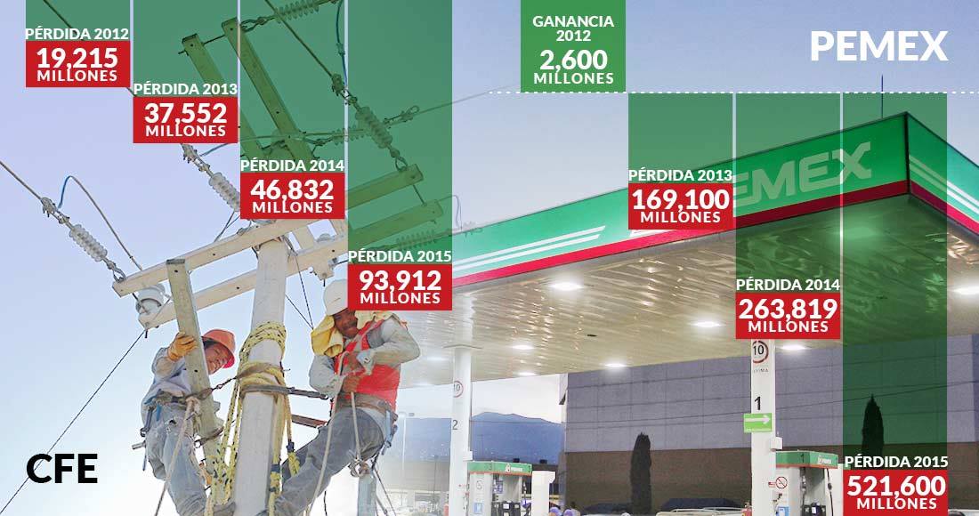 En 2015, la CFE reportó pérdidas históricas, a pesar de ello, debía pagar jubilaciones a 42 mil trabajadores que suman un gasto de 620 mil millones de pesos, para el tercer trimestre del año, tuvo una pérdida de seis mil 898 millones de pesos.