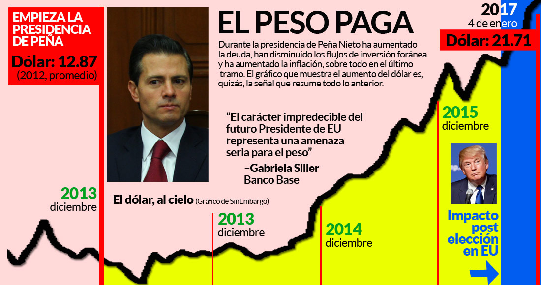 Estos factores, sumados a la depreciación del peso frente al dólar en el último año -de entorno al 25 por ciento- y a las amenazas proteccionistas del presidente electo de Estados Unidos, Donald Trump, "conforman un coctel explosivo que empuja a los mexicanos a una peligrosa espiral de violencia".