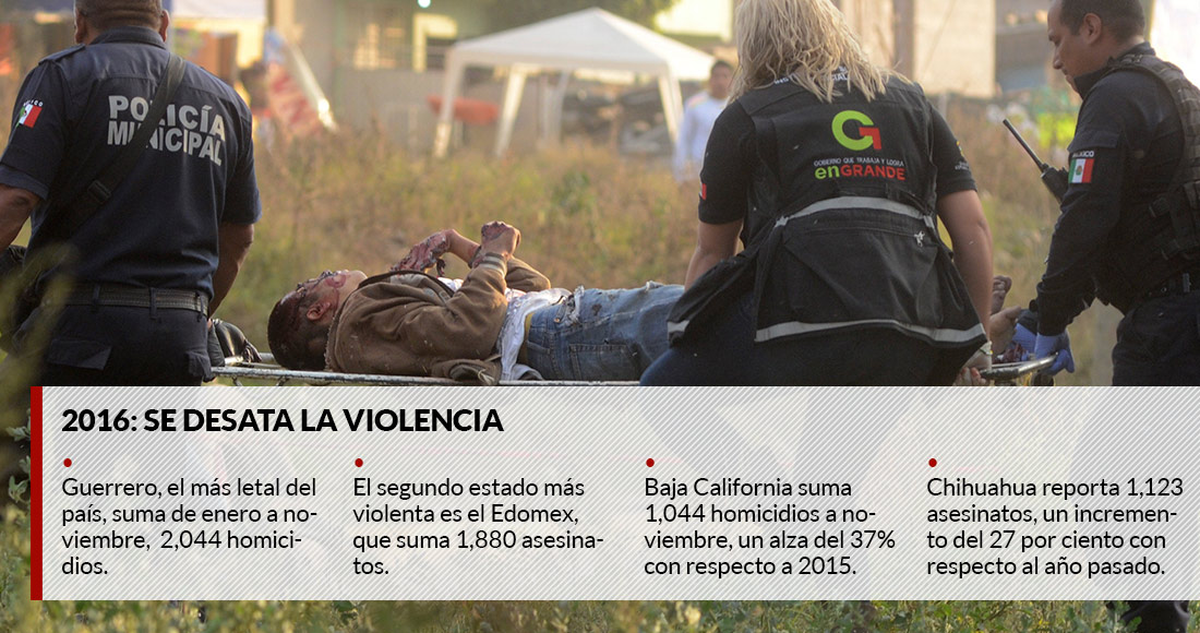 Además, este 2016 la violencia en el país repuntó y de enero a noviembre, según datos oficiales, se registraron 18 mil 915 carpetas de investigación por homicidio doloso por homicidios. De acuerdo con datos de octubre de la PGR, en el país hay nueve cárteles y 37 células delictivas, entre ellas: el CJNG, Los Caballeros Templarios, el Cártel del Golfo, Los Zetas, el cártel de los Beltrán Leyva, la Familia Michoacana y Pacífico.