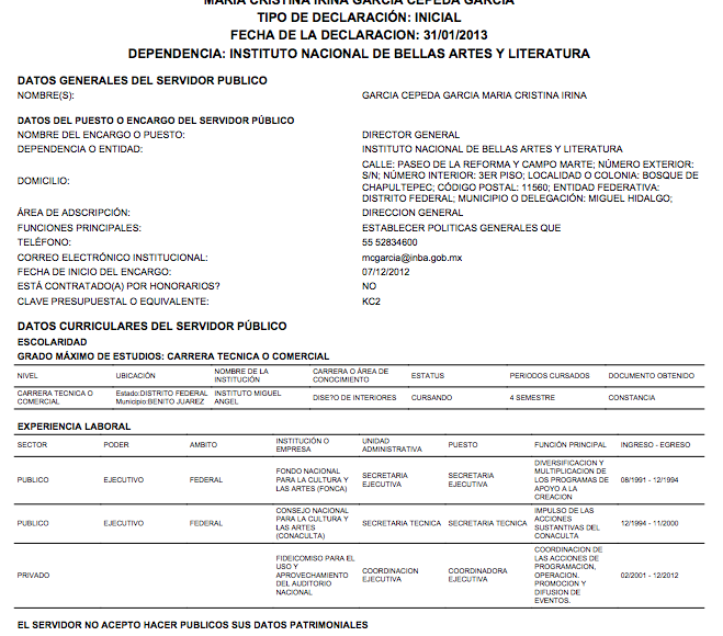La nueva Secretaria de Cultura expone que no está de acuerdo en hacer públicos sus datos patrimoniales como tampoco sus “posibles conflictos de interés”. Eso, en cuanto a la obligación que tienen los servidores públicos de presentar su patrimonio ante la Función Pública. Respecto a la iniciativa ciudadana 3de3 de varias organizaciones no gubernamentales que convoca a los políticos mexicanos a la transparencia de sus bienes, intereses y obligaciones fiscales, de María Cristina García Cepeda no hay nada. La nueva Secretaria de Cultura no tiene 3de3.