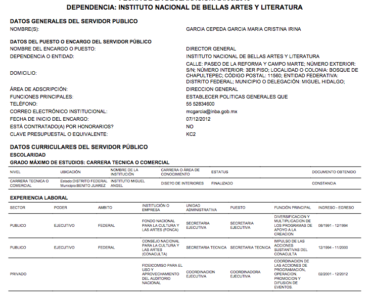 Cuando en 2012, la nombraron Directora del INBA, la llamaron “doctora”; pero María Cristina García Cepeda carecía de ese grado. De hecho, no contaba con licenciatura, ni maestría. En 2014 se vio orillada a corregir ese dato curricular publicado en la página oficial de la SEP, dependencia para la cual, trabajaba.