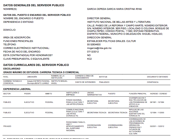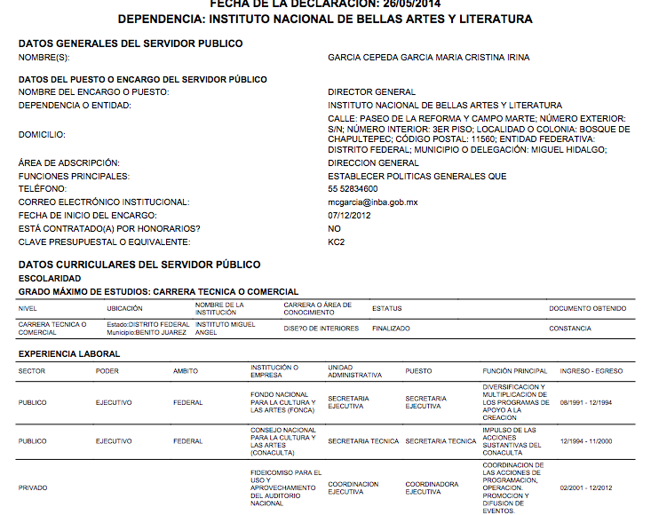 El 31 de enero de 2013, cuando tenía dos meses como Directora del Instituto Nacional de Bellas Artes (INBA), García Cepeda presentó su declaración patrimonial “inicial”. En ella, asentó que se encontraba cursando el cuarto semestre de la carrera de Diseño de Interiores y que contaba con una constancia para acreditarlo, según Declaranet plus, la plataforma donde los funcionarios están obligados por a mostrar su currículum profesional y académico, así como sus bienes muebles e inmuebles. La siguiente declaración de María Cristina García Cepeda fue publicada el 24 de mayo de 2013 y en ella escribió que el “estatus” de su carrera era “finalizado” y de lo cual, también tenía una “constancia”.