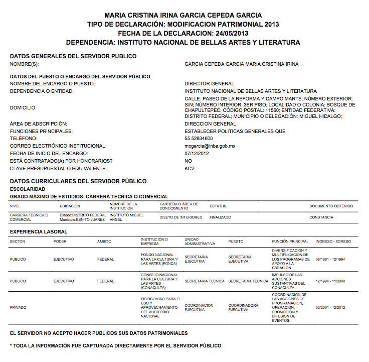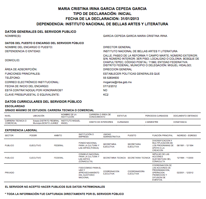 El 31 de enero de 2013, cuando tenía dos meses como Directora del Instituto Nacional de Bellas Artes (INBA), García Cepeda presentó su declaración patrimonial “inicial”. En ella, asentó que se encontraba cursando el cuarto semestre de la carrera de Diseño de Interiores y que contaba con una constancia para acreditarlo, según Declaranet plus, la plataforma donde los funcionarios están obligados por a mostrar su currículum profesional y académico, así como sus bienes muebles e inmuebles. La siguiente declaración de María Cristina García Cepeda fue publicada el 24 de mayo de 2013 y en ella escribió que el “estatus” de su carrera era “finalizado” y de lo cual, también tenía una “constancia”.