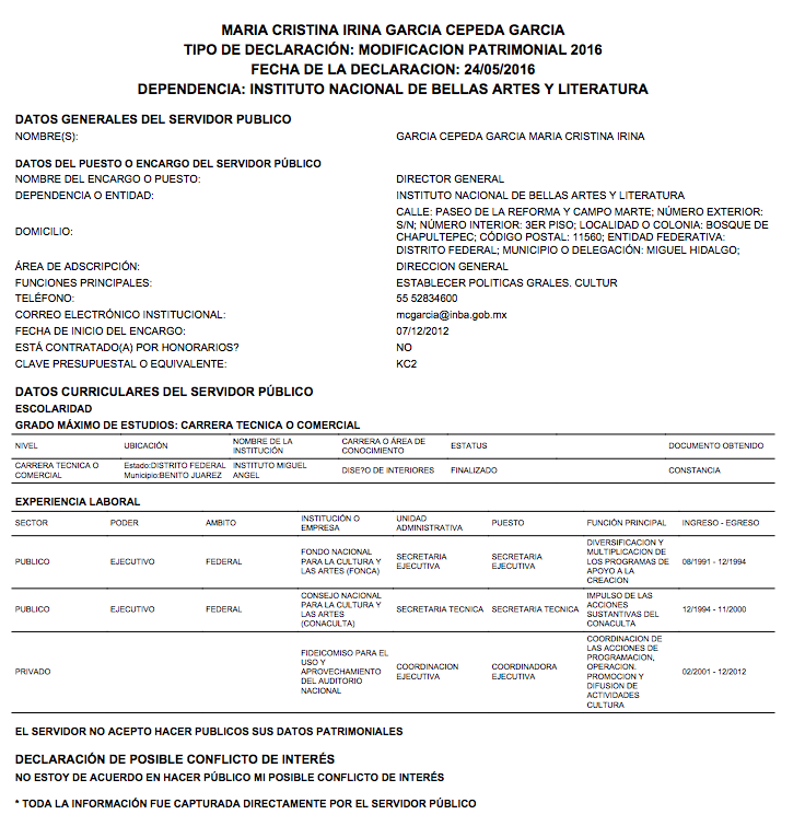 La nueva Secretaria de Cultura expone que no está de acuerdo en hacer públicos sus datos patrimoniales como tampoco sus “posibles conflictos de interés”. Eso, en cuanto a la obligación que tienen los servidores públicos de presentar su patrimonio ante la Función Pública. Respecto a la iniciativa ciudadana 3de3 de varias organizaciones no gubernamentales que convoca a los políticos mexicanos a la transparencia de sus bienes, intereses y obligaciones fiscales, de María Cristina García Cepeda no hay nada. La nueva Secretaria de Cultura no tiene 3de3.