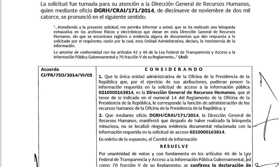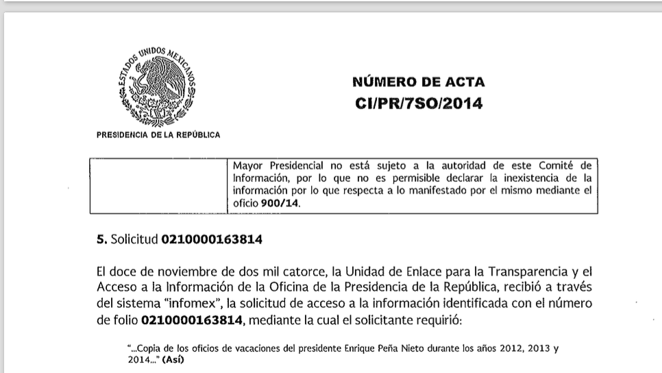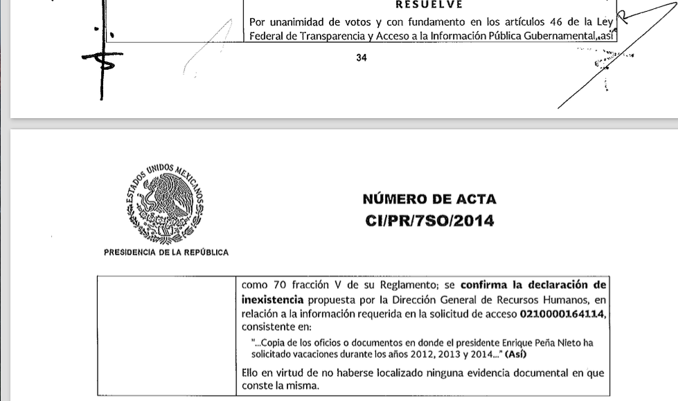 Pero en el caso de Enrique Peña Nieto, casi siempre, sus ausencias o periodos vacacionales han coincidido con una crisis en el país. Si en el futuro, alguien se propusiera conocer en qué formato, circunstancias y asesorado por quién el Primer Mandatario con el índice más bajo de aprobación de la Historia, se fue de vacaciones, no encontrará nada archivado en Los Pinos. En la Residencia Oficial no ha quedado registro de las solicitudes de Peña Nieto para tomar días de asueto. La Dirección de Recursos Humanos, la instancia que podría contar con estos documentos, declaró “inexistente” cualquier papel de 2012, 2013 y 2014 relacionado con los periodos de descanso del Presidente Enrique Peña Nieto.