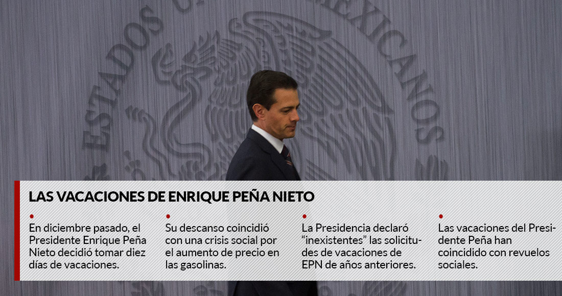 #DatosCerrados | Tiene derecho a ellas como cualquier trabajador. Pero las vacaciones del Presidente Enrique Peña Nieto casi siempre han coincidido con crisis sociales o tragedias, como la desaparición de los 43 normalistas o la explosión de la Torre B2 de Pemex. Y ello ha contribuido a hundir ese índice de aceptación de su Gobierno que desde 2013 no ha repuntado. Las que tomó en diciembre pasado transcurrieron mientras la población reclamaba el súbito aumento en el precio de las gasolinas. ¿En qué formato pide vacaciones el Primer Mandatario? ¿Se asesora? ¿Sabe cuándo es el momento adecuado para irse a descansar? La Presidencia de la República declaró “inexistente” cualquier documento al respecto de 2012, 2013 y 2014.