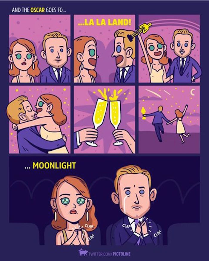 Sin embargo, esta no fue la decepción más destacada, pues por primera vez en 89 años de los Óscar se cometió un grave error: se anunció que La La Land se alzaba con el máximo galardón, y en realidad la mejor película fue Moonlight.