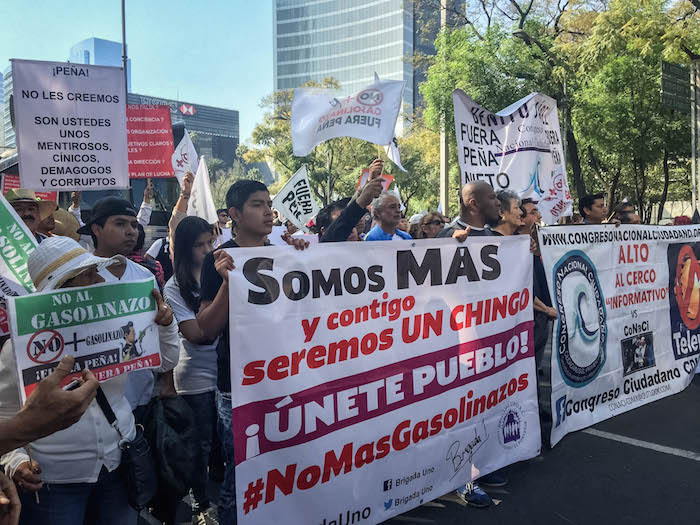Ciudad de México, 15 de enero (SinEmbargo).– Las protestas en contra del aumento a los precios de la gasolina continúan este domingo. Niños, jóvenes, madres de familia, trabajadores, productores agrícolas, transportistas y estudiantes salieron a las calles en la Ciudad de México, Tabasco, Jalisco y Oaxaca, para manifestarse en contra del gasolinazo, a 15 días de que el Gobierno federal incrementó el precio al combustible y que ha derivado en el alza de otros productos.