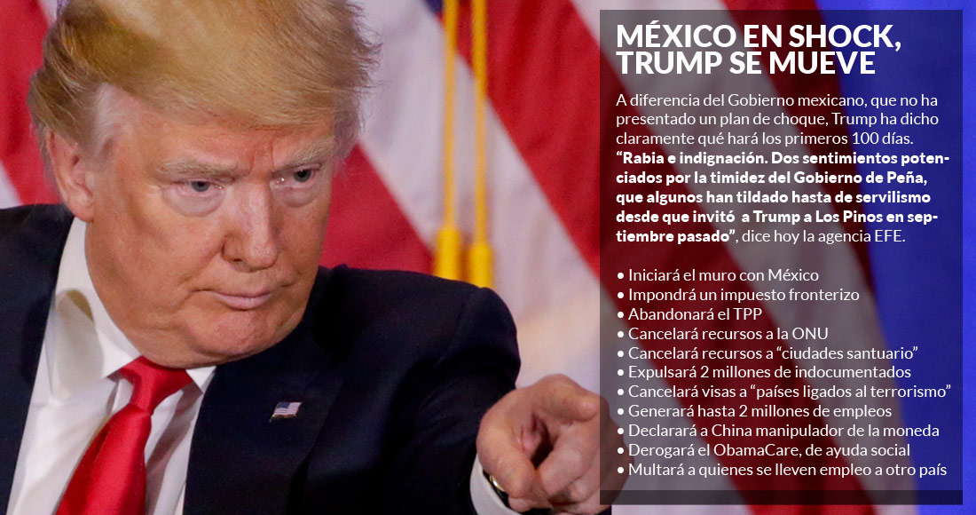Trump ha anunciado que impondrá tarifas arancelarias del 35 por ciento en la frontera bilateral, hasta ahora inexistentes gracias al Tratado de Libre Comercio de América del Norte (1994) que él exige renegociar, a aquellas empresas estadounidenses que desplacen sus operaciones a México para importar luego su producción.