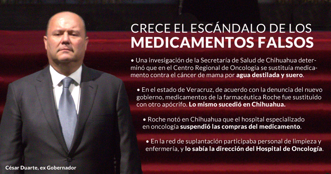 Como en Veracruz, enfermos de cáncer de Chihuahua recibían medicamentos falsos. De acuerdo con una investigación de la Secretaría de Salud, el personal del Hospital de Oncología recogía frascos originales de la solución, se los llevaba, los rellenaba con los placebos y los volvían a vender a la dirección, que los adquiría a través de compras directas. Esto sucedió durante el Gobierno de César Duarte, quien está acusado de haber desviado dinero público.