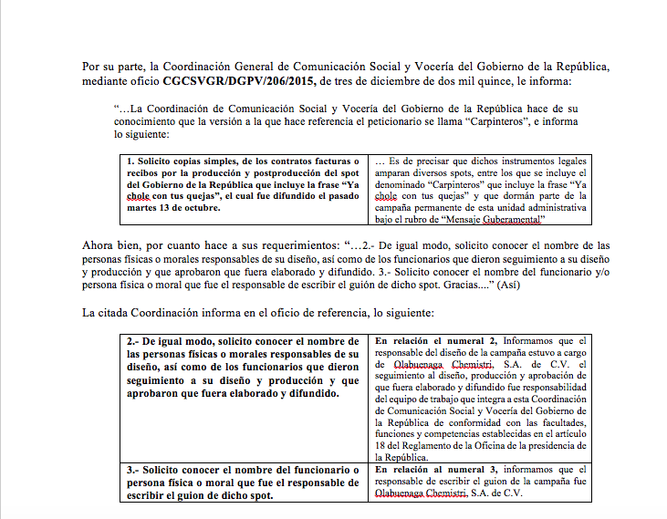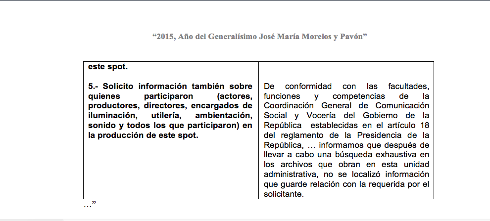 ¿Quién fue el autor del contenido del anuncio? Contratada la agencia Olabuenaga Chemistri para el diseño del guión y los Estudios Churubusco Azteca para la producción, la Presidencia de la República sostiene en dos respuestas a ciudadanos mediante el Instituto Nacional de Acceso a la Información Pública y Protección de Datos Personales (INAI) que no conoce qué guionistas, actores, productores, directores, encargados de iluminación, utilería, ambientación o sonido fueron contratados para la elaboración del infomercial.