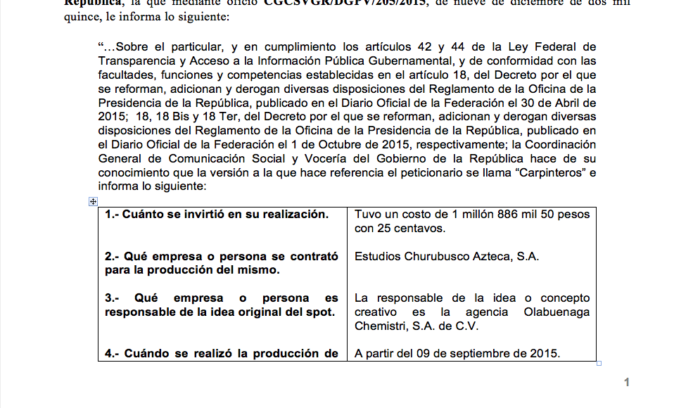 #DatosCerrados | El Gobierno de Enrique Peña Nieto se permitió gastar 1.8 millones de pesos en el anuncio “Carpinteros”, mejor conocido como “Ya chole con tus quejas”. Duró sólo un día al aire. El enojo que causó invadió a las redes sociales al grado que en Los Pinos reconocieron que “eran sensibles a la controversia” y habían decidido retirarlo. ¿Quién fue el creativo del contenido del promocional? ¿A quién se le ocurrió la frase que caló tanto? La Presidencia dice que desconoce esos datos dado que el encargo para el infomercial se lo hizo a la agencia Olabuenaga Chemistri. Lo pagado por el anuncio equivale a 786 meses de salario mínimo. Un mexicano tendría que trabajar unos 12 años sin descanso para alcanzar la cifra en percepciones.